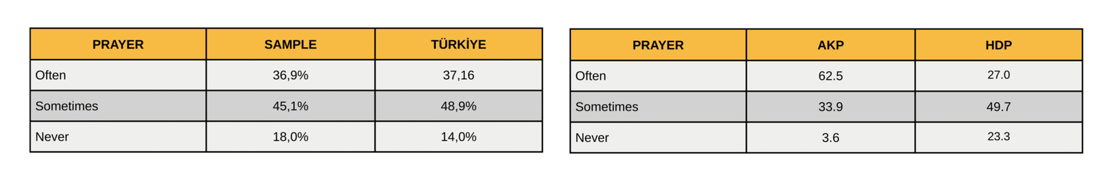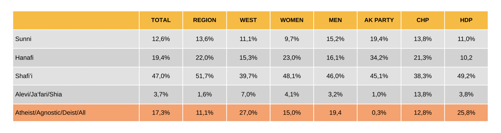 This finding partly confirms the general perception that young people close to Kurdish politics, as represented by the HDP, are distancing themselves from religion and becoming more secular. While secularization among Kurdish youth appears to be progressing more rapidly than among other youth, the acceleration of secularization across generations also appears to be linked to political attitudes.