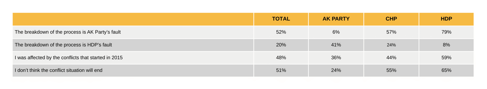 Young people report that discrimination decreased and life became easier during the periods when the Kurdish issue was undergoing a resolution process. Although the actors whom young people hold responsible for the breakdown of the resolution process vary according to party affiliation, and despite the current situation painting a pessimistic picture, the youth demonstrate a strong demand for the resolution of the Kurdish issue. Among those who report being more physically or psychologically affected by the period of violence, as well as among those who most strongly demand a new resolution process, the proportion of young people supporting the HDP is higher.