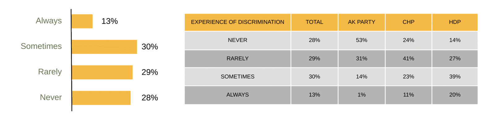 On the other hand, as mentioned above, despite sharing a Turkish identity and culture, nearly half of Kurdish youth state that they would prefer not to have a Turkish partner. One of the main reasons for this response is the discrimination experienced by young people. Despite their intention and plans to live in Türkiye and build a future in the western provinces, the high proportion of those who do not want to have a Turkish partner is a striking finding, as it indicates that discrimination and its effects create barriers between the groups. This data suggests that Kurds, and particularly Kurdish youth, have a “Kurdish habitat” in the western provinces where they can live, and that having such a habitat may facilitate distancing from the wider society.