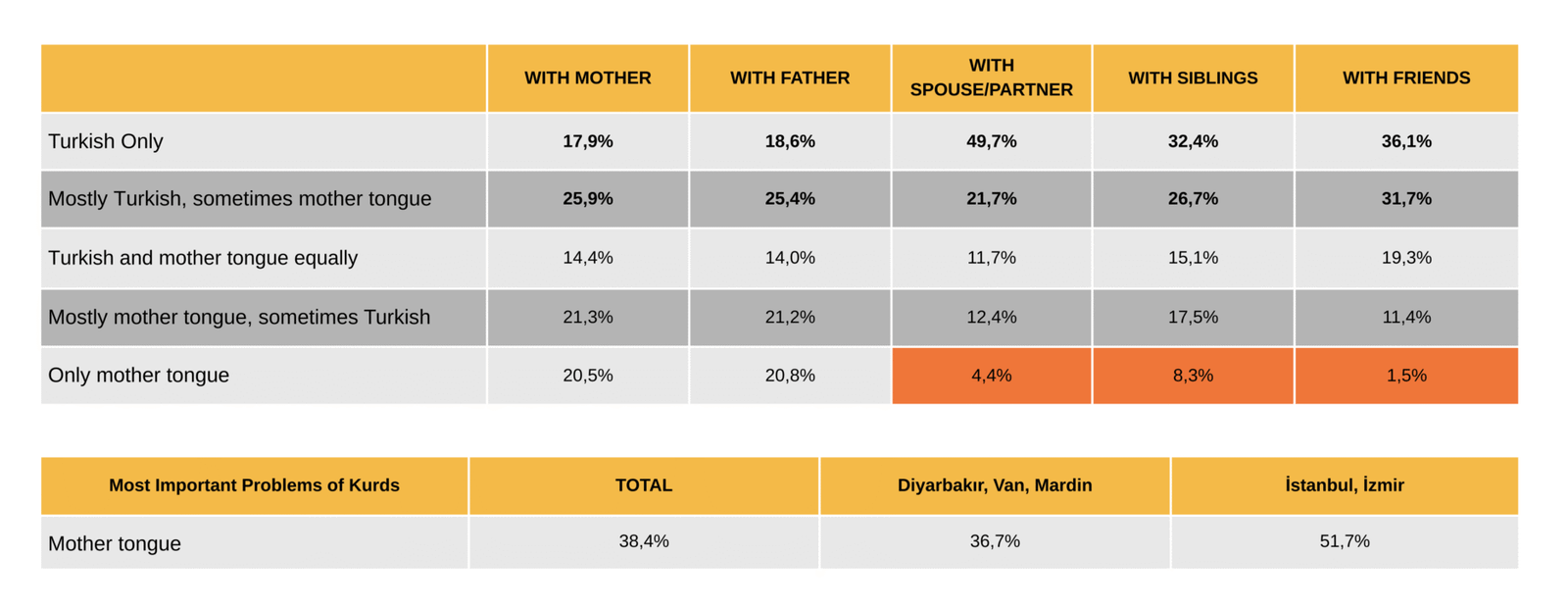 Although half of Kurdish youth report proficiency in their mother tongue, they rarely use it in daily life. At least one-fifth of respondents do not speak Kurdish and almost never use the language. Most of those who previously spoke Kurdish report that its use has declined over time and that the language has been forgotten. A significant proportion of those who report having an intermediate or good command of the language predominantly speak Turkish. Those who know Kurdish use it most frequently when speaking with their mothers and fathers. The proportion of those who speak mostly or exclusively Kurdish with their parents is approximately one-third. The vast majority of young people use Turkish when communicating with siblings, friends, and spouses/partners.
